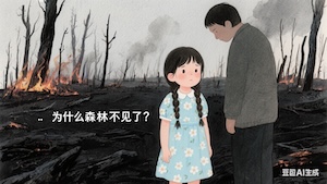 可是,有些人為了賺錢,偷偷放火燒了森林。大火燒了三天三夜,樹木變成了焦炭,動物們逃走了,大地變得黑漆漆的,像在哭泣。