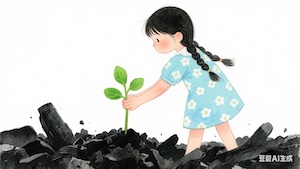 小女孩在灰燼裡發現了一棵小小的樹苗,嫩嫩的,綠綠的。她輕輕把它捧起來,說:「別怕,我會保護你。」