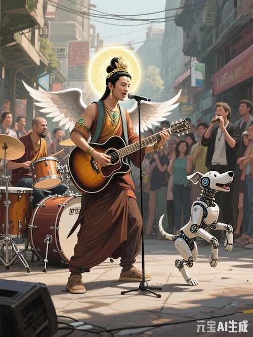 入世菩薩街頭演唱,用歌聲治癒人心。歌詞唱著「憂慮化成河,苦日總是多,心中求安穩,只好唸彌陀」