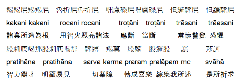 佛言善男子善哉善哉。汝能哀愍一切有情作如是請。諦聽諦聽。吾今為汝略說拔濟眾苦方便。善男子有佛世尊。名為不動如來應正等覺。為欲利樂諸有情故。說陀羅尼令眾誦念。陀羅尼曰。