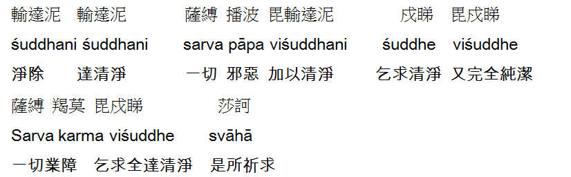 若有善男子善女人。至誠敬禮不動如來應正等覺受持此呪。先所造作五無間業四重十惡。毀諸聖賢謗正法罪皆悉除滅。臨命終時。彼不動佛與諸菩薩來現其前。讚歎慰喻令其歡喜。復告之言。今來迎汝應隨我往所從佛國。彼命終已。決定往生不動如來清淨佛土。善男子復有世尊。名滅惡趣王如來應正等覺。為欲利樂諸有情故。說陀羅尼令眾誦念。陀羅尼曰。