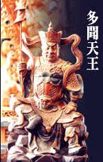 又名毗沙門,「多聞」以福,德知名聞於四方。住須彌山水晶埵,身為綠色,穿甲冑,右持寶傘(又稱寶幡),左手臥神鼠﹣銀鼠。用以制服魔眾,護持人民財富。又名施財天,是古印度的財神,在唐代他曾幫唐明皇退蕃兵的圍困,轟動一時,唐明皇為感恩,特命「諸道州府城西北及營寨並設其相」供養,佛也特設別院供養。是『二十諸天』中的第三天王。