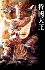 「持國」意為慈悲為懷,保護眾生,護持國土,故名持國天王。住須彌山黃金埵,身為白色,穿甲胄,手持琵琶,是主樂神。表明他要用音樂來使眾生皈依佛教,他負責守護東勝神州。是『二十諸天』中的第四天王。