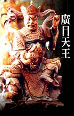「廣目」意為能以淨天眼隨時觀察世界,護持人民,故名廣目天王。住須彌山白雲埵,身為紅色,穿甲冑,為群龍領袖,故手纏一赤龍(也有的作赤索),看到有人不信奉佛教,即用索捉來,使其皈依佛教。他負責守護西牛賀洲。是『二十諸天』中的第六天王。