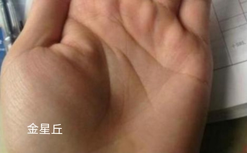 手掌的拇指下面,最高漲移之地方,叫做「金星丘」,表彰一個人的精力和體力。 如果高漲而結實的話,表示這個人精力充沛,元氣旺盛。 女性如果這部份高漲,生育機能旺盛,容易成孕,也生產順利。 如果男性這地方高漲,代表體能和體力都好,性能力也高强。 如果這一帶的顏色青喑(如圖示),代表近來睡眠不足,或睡眠質素不良。 青暗之色澤如果漫延到掌中心部分,表示氣管受到感染,快要咳嗽了。