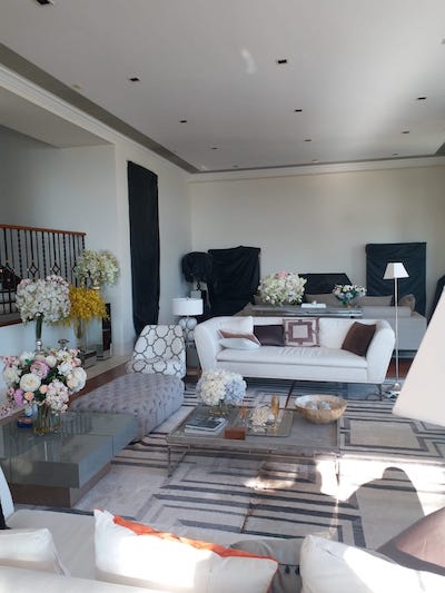 圖中住宅面積寬敞,算是豪宅了,但郤差一點便是一片雪白,地毯的圖案及几桌上的花朵,都是按我建議才添加的。