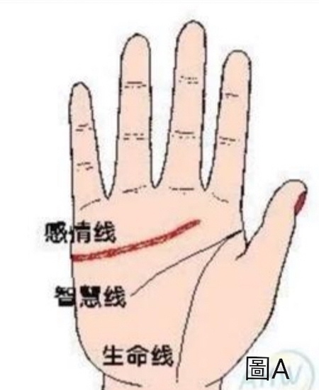 例如手掌中接近手指的一條線,西洋相法叫感情綫,專講感情之事(見圖A)。