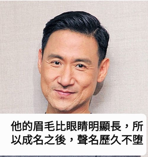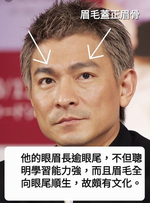 每條眉毛都只向後一個方向順生,代表個性較溫文,且有文化氣質,附圖的大明星劉德華便是好例證,他雖是大忙人,但他的書法很有味道。