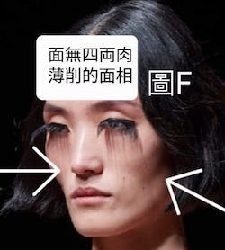 圖E及F,面頰凹陷,以前農業社會是營養不良,是一個壞訊號。現在有可能是刻意減肥,但郤容易損害健康。