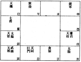 例如:太陰獨坐巳宮,作為一個大運的命宮或流年命宮,一般只憑太陰在巳宮的性質,以及在三方四正所會合的星曜,來推斷此大運或流年的吉凶。但中州派則不同,依循上述方法,除了太陰的三方四正之外,還必須注意到------