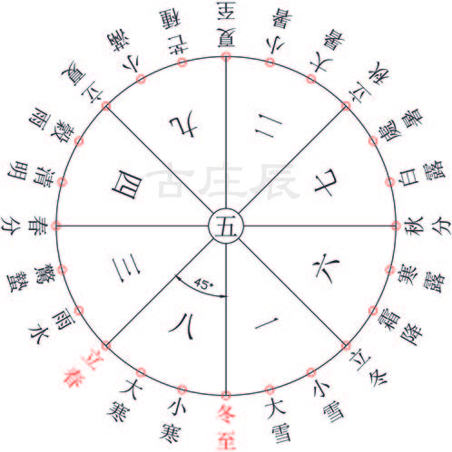 相對太乙九宮於洛書逆時針轉一個宮卦的情況,與冬至到立春的夾角同樣也是45度。
