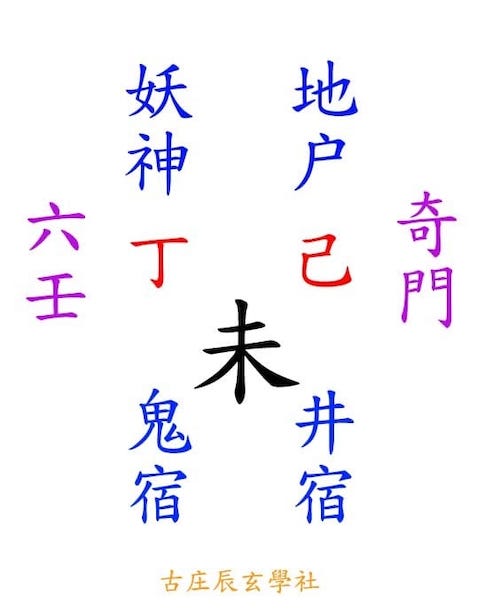 在奇門遁甲中,己土名為地户,一般可代表鬼怪及墳墓,而在大六壬裡面,則以丁火作為鬼怪的符號,所臨之處,動盪不安,專主不祥,故名為妖神。無論是奇門的「己」,還是六壬的「丁」,原來其意義均是來自二十八星的「鬼宿」,理由是鬼宿寄於「未」宫之中,而「未」就是丁及己的本家。