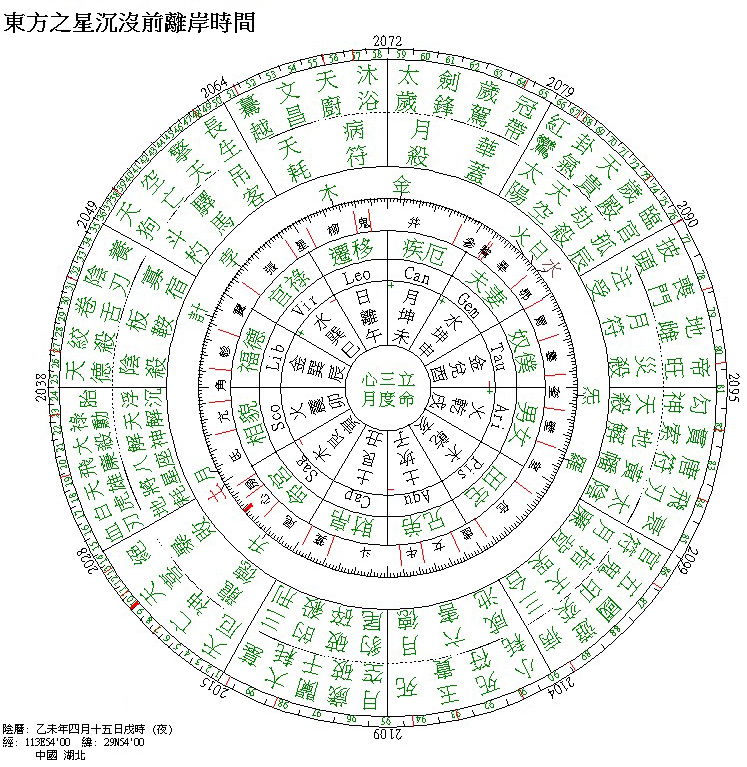 以上是按東方之星客輪沉沒前的離岸時間 – 2015年6月1日戌時、出發地點 – 湖北省赤壁市,所起的七政四餘擇日星盤。