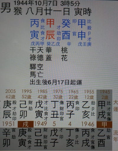 各位再看看,這命是申年,遥冲時支寅木,且冲用神,這叫正式的「海底逢冲」,主晚年破敗。