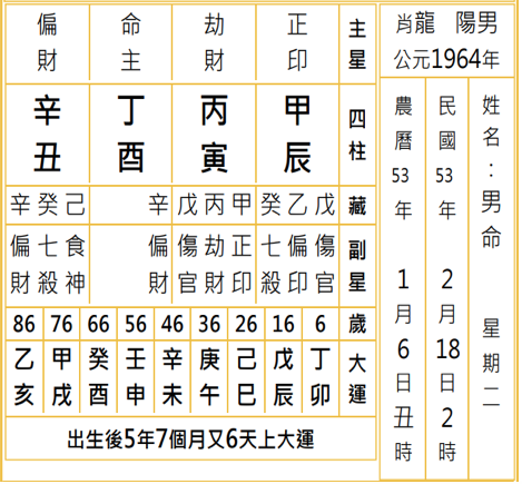 以下,是一位男性熟客,在二O一八年尾,陽曆十二月四日光顧,要問一問明年二O一九「己亥」豬年的凶吉,他出生於一九六四年陽曆二月十八日丑時。