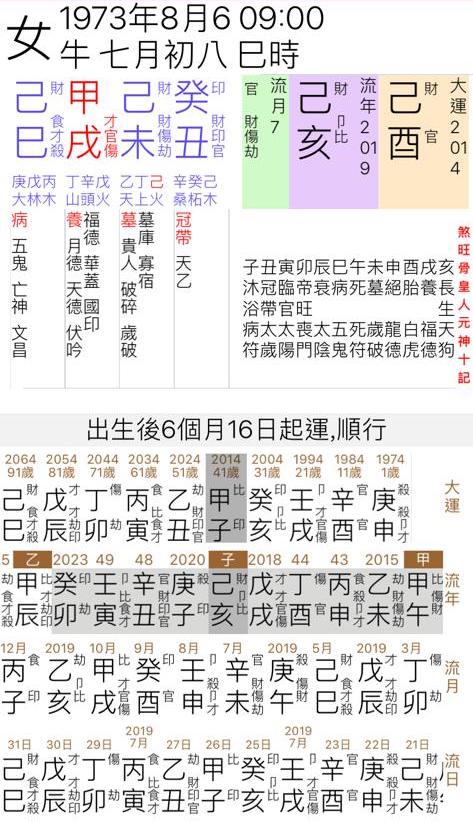 附圖的一個女命,生於一九七三年陽曆八月六日,巳時,是一個頗考人的八字。