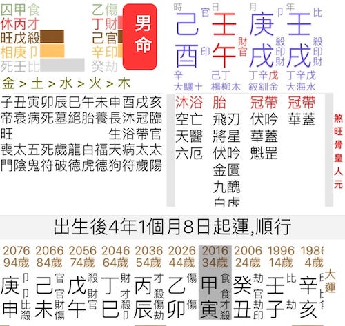現在八字裡的庚金,即是這個身為老闆的年青高手,看見大運甲寅,注碼便大增。但是財星郤合成且生起「寅午戌」官殺局,庚金代表的高手仁兄,正是俗語說的「見財化水」,必然輸多贏少了。