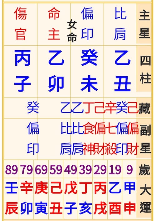 而癸水側邊的两個乙木和卯木是癸水的食傷星,食傷星是狂傲之星,癸水有祿位子水為根是有才可恃,有形容詞叫「恃才傲物」,没有才學為根基的不叫傲,叫驕。