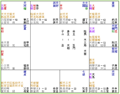 董伯伯在1937年7月7日上海出生,命宮無正曜,借對宮日月入宮安星。個性較保守,做事嚴謹,剛柔並濟,不逾規矩。智慧較高,早年即開竅,能將所學變化運用,而漸漸亨通。古人云:「日月同丑,命安未,侯伯之材。」天刑入命,見文曲文昌,有權勢及功名。見化祿化權化科,能有很高的成就,但又見化忌擎羊陀羅,一生中必遇到較大挫折。