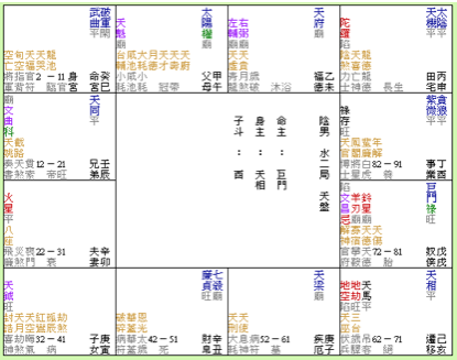 觀其命盤,命宮武曲破軍,多喜與人合作,以軍功起家,武曲主為人決斷,行動力強,這符合了其統領千軍萬馬的元帥身份,本吉。惟同宮有破軍星,破軍化氣為耗,古人用耗字形容破軍其實十分貼切,破軍本性好像陣前衝鋒的敢死隊,往往衝動行事,不計後果,和敵人玉石俱焚。而武曲的執行力,加上破軍的勇往直前蠻勁,孰優孰劣,要看武曲和破軍哪個影響力較大。