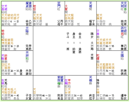 命宮坐巳宮,得廉貞、貪狼坐守,武曲、七殺於酉宮來會,此乃「殺拱廉貞」格,一生較多變化。古歌云:「貞逢七殺實堪傷,十載淹留有災殃,運至經求多不遂,錢財勝似雪澆湯。」古人認為廉貞貪狼為桃花,武曲七殺為刑傷,所以四顆星曜配合起來,便是破盡祖業,流離浪蕩之人。即大限逢之,雖不主其人的性格浪蕩,亦主十年破敗。廉貞貪狼的本質較陰柔。廉貞主感情,廉貪,見煞忌,主飄流四海,棄祖離家。既主感情,與桃花諸曜咸池、天喜、天刑、天姚同會,便轉變為男女感情。貪狼主行動,廉貞主思想,換言之,貪狼的桃花主征歌逐色,廉貞的桃花卻主刻骨銘心。婚姻多不利,易藕斷絲連。此外命宮亦為「文星遇夾」格,即文昌守命,遇地空地劫相夾,一般主典試不利;但不利的原因並不是由於沒有學問,而是遭到莫名其妙的失敗。
