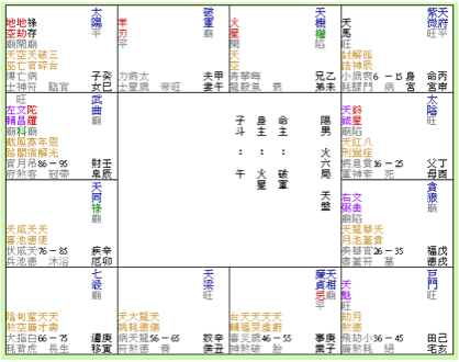 溥儀命盤田宅宮巨門獨坐亥宮,巨門為暗曜,於亥宮光輝全無,田宅代表祖業,其衰敗可期。更甚者田宅宮天干為己,引發武曲自化忌入財帛宮,武曲為財星,化忌於財帛宮,可見其登位後,國庫已虛,欲救無力。尤其是到了後期,要從故宮偷運古玩變賣,誠可笑,更可悲也。