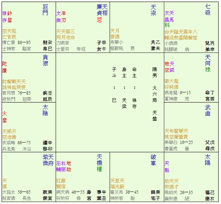 再看其事業宮,天機化權、左輔右弼、地劫會地空、紅鸞會天喜。先談談天機化權,天機是動星,代表事業上變化大,他一生為革命奔波,應數也。而左輔右弼,足見他能夠找到大量扶助他的貴人。雖然孫中山一生貢獻給革命事業功不可沒,但沒有他身邊一幫同志的協助,亦勢難成事。另外,空劫於事業宮代表從事偏冷行業,七十二行之中,搞革命真的可算冷門了。至於紅鸞天喜照會,則代表其一生於工作上易與同事產生感情。縱觀孫中山一生的幾個異性伴侶,除元配盧慕貞是父母配婚外,還有革命伴侶兼紅顏知己陳粹芬,但最出名當然是第二任妻子宋慶齡,均是他工作上的得力助手。夫妻宮天梁獨守未宮,每每主婚姻帶有「災難」的性質,一般來說,天梁在夫妻宮,多主初戀失敗,更見煞,則終身對此未能忘情,以致痛苦,見地劫、火星,主有第三者介入。見左輔、右弼,主熱戀時受到挫折、阻力,或因客觀環境而致中道分開。因會合的星曜吉凶交集,則可能有解除婚約、婚姻受到壓力、婚禮被逼延期、男女情投意合而礙於客觀環境不能結合、或在結婚前一方突然要往外地,種種情形,亦可視為「災難」。以上徵兆近乎孫先生狀況:他有一段退位讓賢的婚姻,話說其元配盧氏,實為樸實內向之傳統女性,孫中山就任臨時大總統後的應酬已是大吃不消,得知於孫中山日後能有宋慶齡照顧扶助,她反而樂得引退。及至第二段與宋慶齡的婚姻,開始時遇到的壓力,女方家長的反對,確實非筆墨所能形容。幸天梁守夫妻宮會照對宮天機化權,加上天梁在乙未自化權,引發天機化祿飛入事業宮,顯示工作上能得到配偶助力,為催旺事業的根源。
