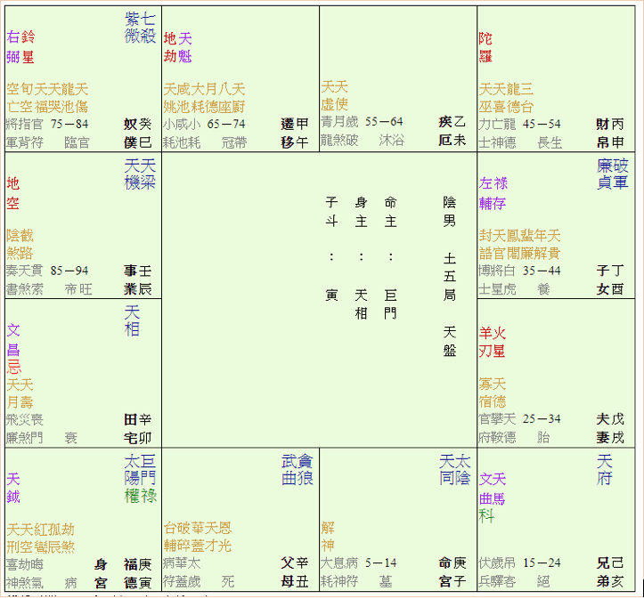 這個盤的文昌在卯宮天相,天相的對宮為破軍在酉,破軍與廉貞同在,天相的中心思想在按步就班,忠實地料理,天相、文昌在斗數的語法底下,便是能循序地學習,對宮的廉貞說的是法制,這是文昌在這個命盤上的意義定位。一個人能否在人生的求學階段,順利地完成正規的學院訓練,要看先天的文昌組合,然後加上人生頭幾個大運的流昌,看與主星的組配是否適當。有利於流昌組配的,主要者為天梁、巨門和廉貞,有關概念,其簡略意義為: