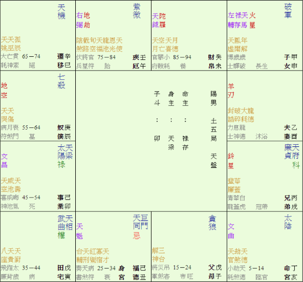 常言道:「人無百日好,花無百日紅。」程生經過近乎完美的兩個戊干大運,到己卯大運(45-54歲)間,命宮有陽梁同宮,除有「陽梁昌祿」格 ,主利競爭外,命主行經天梁大運,期間多會出現至少一次的凶險,程生果然應驗!
