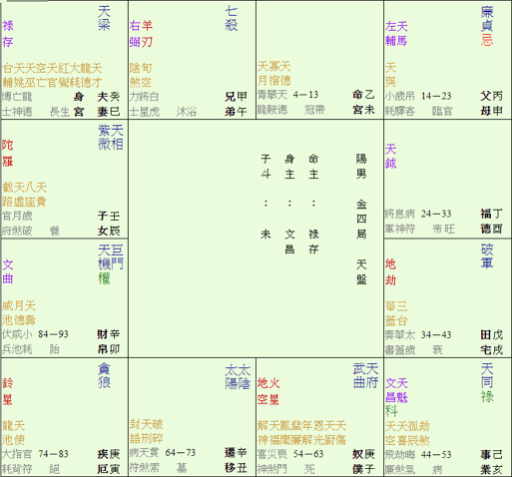 初步分析他的命宮,結合財帛宮、田宅宮和事業宮已感覺他的底氣很強,吉凶過度集中。這個盤的特性是矛盾的組合特多,波折、動盪的組合也多,計有太陽、太陰,為一明一暗、一旺一弱,反差很大;武曲、天府則一行動、一猶豫,一剛一柔;天機、巨門則一機靈、一沉潛,為一輕浮、一暗藏的組合;紫微、天相則一為皇帝、一為侍從,即一役人、一役於人;另天梁、天同處於巳亥,主起伏。這種種組合,便容易做成風起雲湧的局面。其本質最容易出現兩極:能流芳百世,亦能遺臭萬年,為一部分人所指責反對,而又為另一部分人所欽敬推崇。