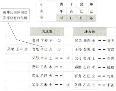 巳火官生世之時便是行動開始之時,巳火臨月令,正在當值生世有力之時,動爻又為陽爻,陽動主過去,陰動主未來,所以事情己在進行中;五爻生世是事情的希望所在,但化亥水回頭沖,亥水臨日令,所謂日月同功,臨日令之亥水雖然被月人戈弓月戈沖也不為破,但亥水的先天條件是克火,所以五爻之官會受到克制而難生世爻,生不了世爻則事難以辦成。子孫代表政策,沖克用神是受到政策影响。