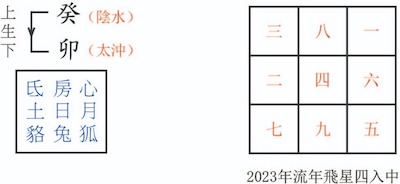 2023 年為兔年,干支癸卯,上水下木,井宿值年,癸水為十天干排行最後一個,在 大六壬的系統中,癸為玄武之精,具有微觀、隱藏之意。然而,卯將又名太沖,古書 云:「太沖天馬最為貴,卒然有難宜逃避。」故卯木有逃亡之意,加上卯為癸的「天 乙貴人」,因此,在綜合分析下,癸卯年有達官貴人逃亡之象。而在另一方面,卯木 為癸水的食神,可是太歲入主的卯宮,卻遇上流年飛星的二黑病符星,形成風水學上 的「二三鬥牛煞」,食神遇此,寓意著有大型食品中毒的意外發生。