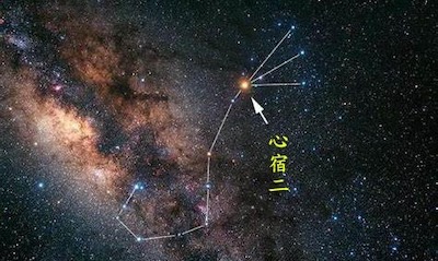 在房宿偏東的左下方,可以找到有一顆亮度極高的恆星,古人稱之為「大火」,屬於東方蒼龍的第五宿,其名字稱為「心宿」,又名「心月狐」,那裡象徵蒼龍的心臟 , 同時也是代表天蝎座的心臟。嚴格來說,剛才提及的大火星,其實是指「心宿二」, 古人對此星非常重視,當象徵災禍的火星在大火徘徊不去的時候,就是所謂的「熒惑 守心」,他們便會大為緊張,憂慮此星象會帶來國君死亡及天災人禍的發生。幸好, 下一次熒惑守心要去到 2048 年才會發生。不過值得一提,於 9 月 21 日申時,將會 發生一次「月掩心宿二」的天文星象,在占星學上,同樣會對當權者帶來負面影響。