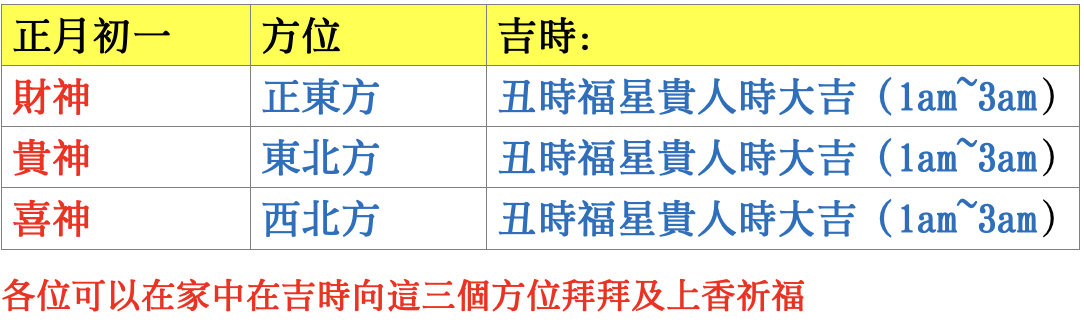 迎春接福,當然就是在大年初一,今年初一(1月22日 凌晨)「財神」在「正東方」,「貴神」(貴人提攜)在「東北方」,「喜神」在「西北方」(婚姻,添丁),最好的是凌晨丑時大吉(1am~3am)為福星貴人時(不要在 1am前,子時為「五不遇時」,為有機會出現卻會把握不住!)。(即是 1月21日 星期六深夜!),可以在家中的神位前,或對著當天(即見到天的窗戶,一般為大廳之大窗)向著該方位拜拜。