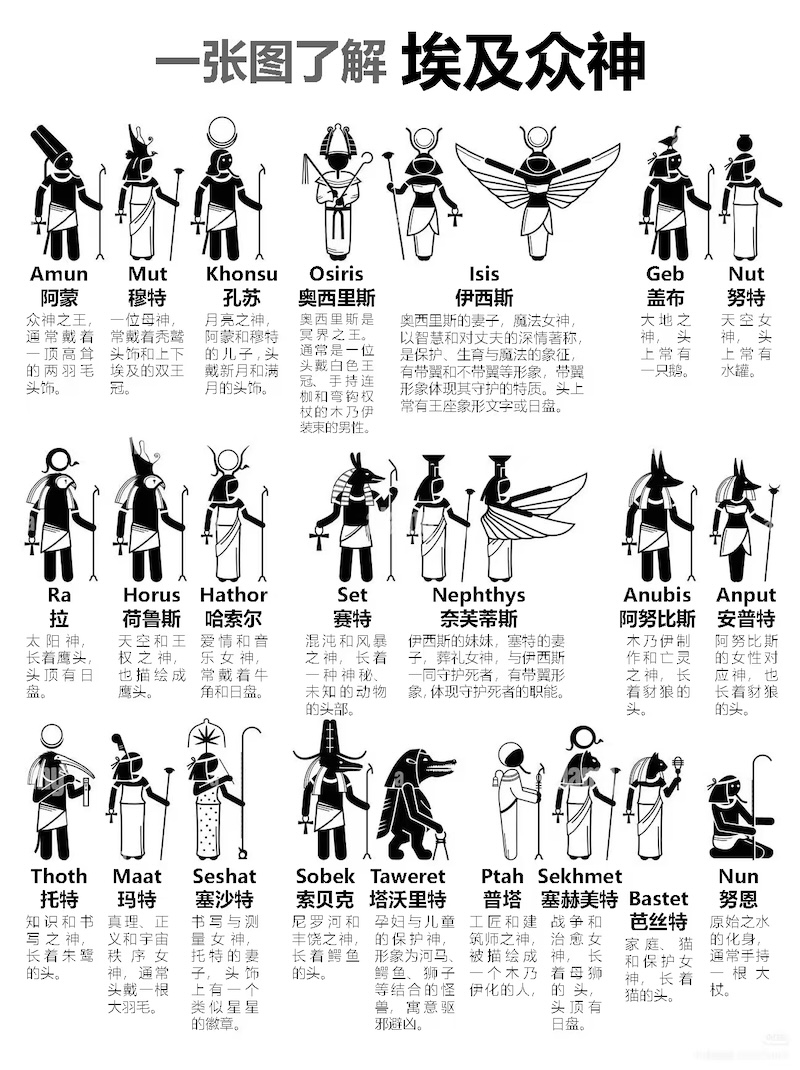 奧西里斯:奧西里斯是冥界之王,負責審判死者的靈魂。他的形象通常是一位頭戴白色王冠、手持連枷和彎鈎權杖的木乃伊裝束的男性。