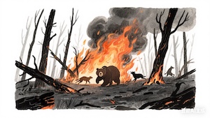 可是,有些人為了賺錢,偷偷放火燒了森林。大火燒了三天三夜,樹木變成了焦炭,動物們逃走了,大地變得黑漆漆的,像在哭泣。