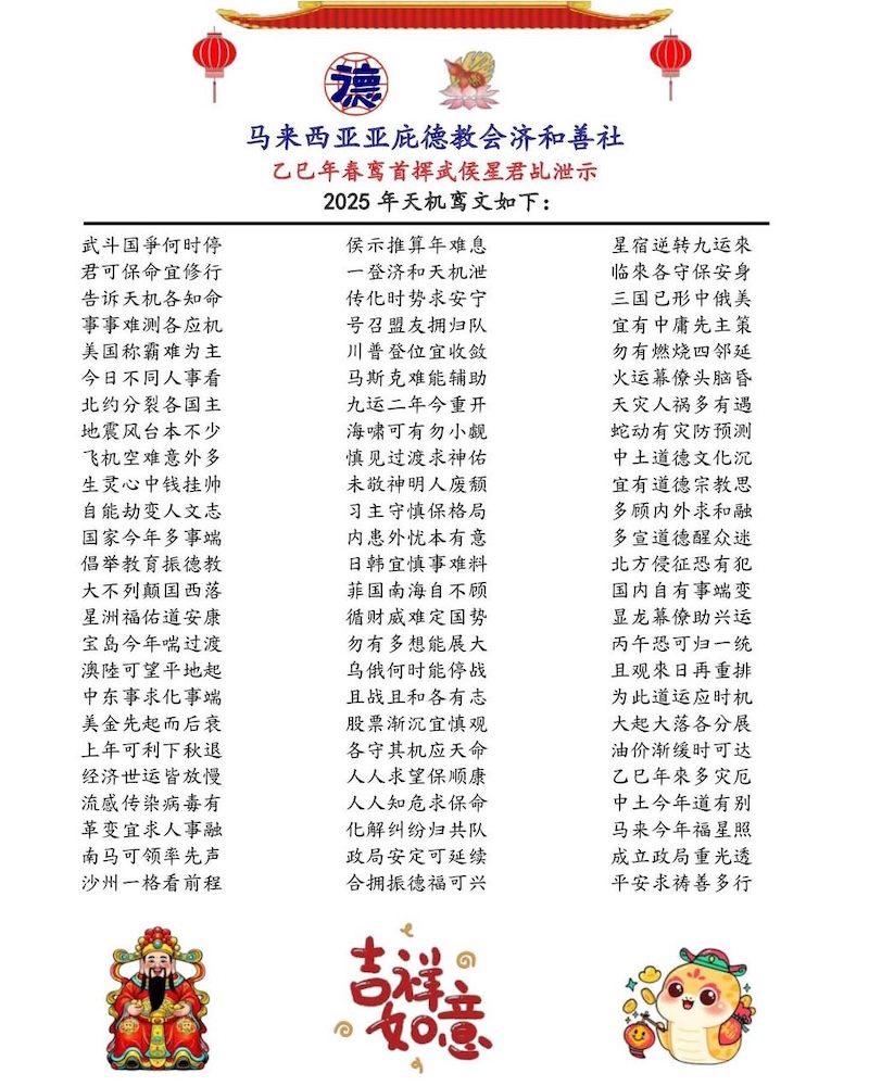 這篇鸞文以馬來西亞亞庇德教會濟和善社的乩示形式,揭示了2025年全球及部分國家的運勢、天災人禍、政治經濟形勢等。以下是對鸞文內容的解讀與分析: