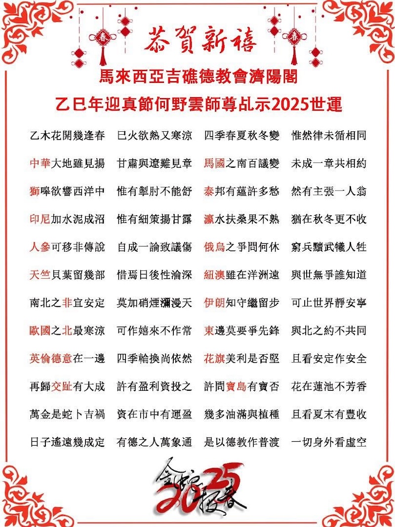 這段文字是馬來西亞吉礁德教會濟陽閣在乙巳年迎真節時,何野雲師尊通過乩示(一種宗教儀式中的占卜方式)所傳達的2025年世運預測。內容涉及全球多個國家和地區,涵蓋政治、經濟、自然等多個方面,充滿了隱喻和象徵。